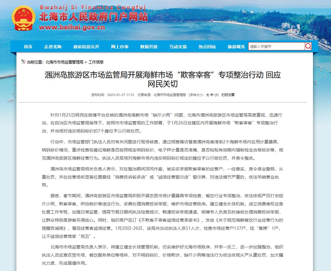 中新網(wǎng)1月28日電 據(jù)北海市市場(chǎng)監(jiān)督管理局網(wǎng)站27日消息,針對(duì)1月25日網(wǎng)民在微博平臺(tái)反映的潿洲島海鮮市場(chǎng)“缺斤少兩”問題,北海市潿洲島旅游區(qū)市場(chǎng)監(jiān)管局高度重視,迅速行動(dòng),在自治區(qū)市場(chǎng)監(jiān)管局指導(dǎo)下,按照市市場(chǎng)監(jiān)管局的工作部署,于1月26日在轄區(qū)內(nèi)開展海鮮市場(chǎng)“欺客宰客”專項(xiàng)整治行動(dòng),并當(dāng)場(chǎng)對(duì)違反明碼標(biāo)價(jià)的7個(gè)攤位予以行政處罰。