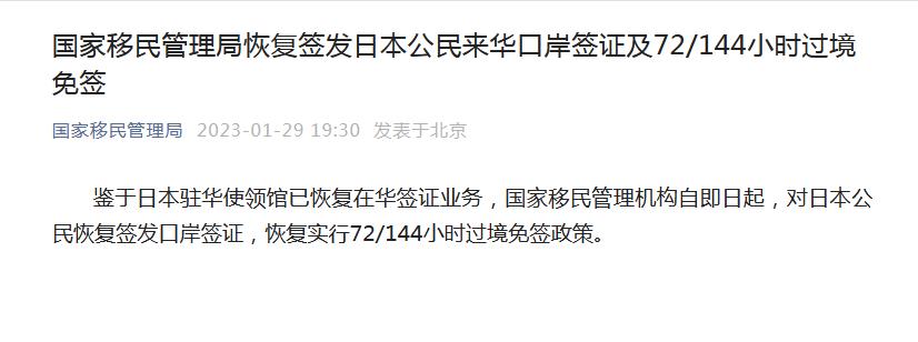 國家移民管理局恢復(fù)簽發(fā)日本公民來華口岸簽證及72/144小時過境免簽