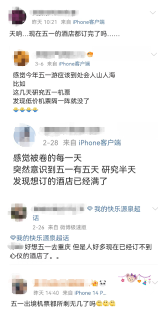 社交平臺上,多名網友早已規(guī)劃好了自己“五一”出行的計劃,并已提前購買機票和酒店,面對緊俏的旅游產品,有網友驚呼:“現在就已經訂不到房了嗎?”“低價機票隔一會兒就沒了!”