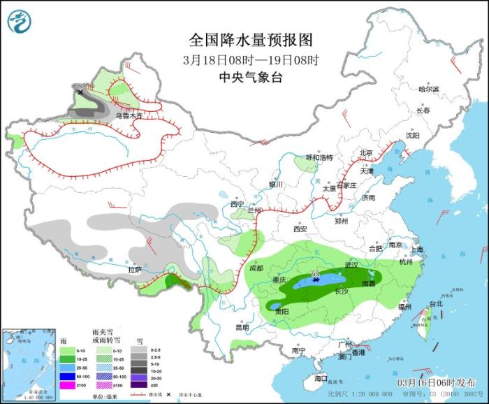 3月18日08時(shí)至19日08時(shí),新疆沿天山地區(qū)和西北部、西藏東部和南部、青海中部和南部等地部分地區(qū)有小到中雪或雨夾雪,其中,新疆沿天山地區(qū)等地局地有大雪(5~8毫米)。西藏東南部、貴州中部和東北部、重慶東南部、湖南中北部、湖北東南部、江西北部等地部分地區(qū)有中到大雨,局地暴雨(50~55毫米)。內(nèi)蒙古中部、黑龍江東北部、新疆北部、西藏中部等地部分地區(qū)有4~6級風(fēng)。臺灣海峽將有6~7級、陣風(fēng)8級的東北風(fēng)。
