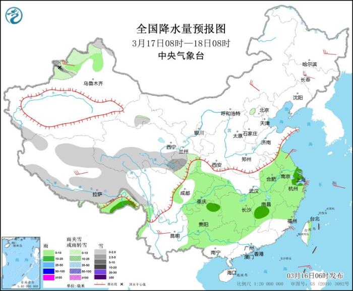 3月16日08時(shí)至17日08時(shí),新疆沿天山地區(qū)和伊犁河谷、西藏東部和南部、青海東部和南部、川西高原等地部分地區(qū)有小到中雪或雨夾雪,局地有大雪(5~7毫米)。黃淮西部、江淮西部、江漢、江南北部和西部、西南地區(qū)東部等地部分地區(qū)有中到大雨,其中,貴州東部、湖南北部等地局地有暴雨(50~80毫米)。內(nèi)蒙古中東部、東北地區(qū)、浙江北部等地部分地區(qū)有4~6級風(fēng)。