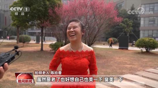 拍照老人 陳拾香:我們以前是農(nóng)村的,做夢(mèng)也沒想到穿婚紗照相的。我這是第一次(穿婚紗),我今天可是特別開心。雖然是老了,也好想自己也美一下。
