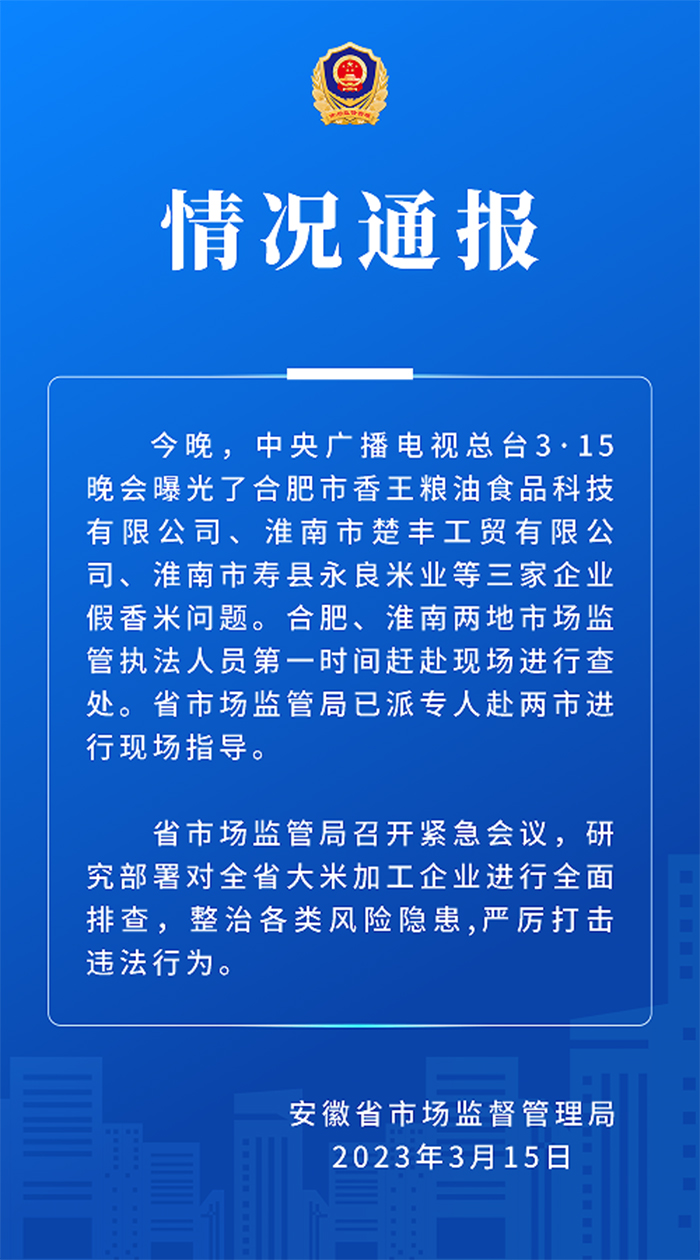 聲明還稱,安徽省市場(chǎng)監(jiān)管局召開緊急會(huì)議,研究部署對(duì)全省大米加工企業(yè)進(jìn)行全面排查,整治各類風(fēng)險(xiǎn)隱患,嚴(yán)厲打擊違法行為。(中新財(cái)經(jīng))