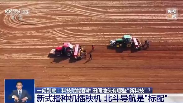 我們先去新疆看看——自帶北斗導航的播種機。在新疆昌吉瑪納斯縣六戶地鎮(zhèn)的千畝春小麥種植基地,裝有北斗導航系統(tǒng)的大馬力拖拉機,帶著改良后的新式播種機,正在進行春小麥播種。這種播種機可按照預先設定的線路進行精量播種,而且覆土、鋪設滴灌帶也同步完成,不僅實現(xiàn)了全程機械化,還提高了作業(yè)精度和效率,每天可比傳統(tǒng)播種機多播50畝地左右。