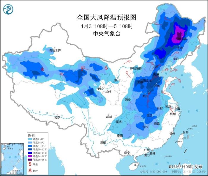 受較強冷空氣影響,4月3日08時至5日08時,新疆南疆盆地、西北地區(qū)中部、內(nèi)蒙古西部和東北部、華北、東北地區(qū)、黃淮、江漢、江淮中西部、江南中西部等地氣溫將下降4~8℃,其中,內(nèi)蒙東北部、東北地區(qū)西部、華北南部等地局地降溫幅度可達10℃以上;上述部分地區(qū)并有5~6級偏北風,陣風7~9級。新疆南部和東部、內(nèi)蒙古西部、甘肅西部等地有沙塵天氣(見圖1)。3日夜間,渤海、黃海西南部海域、東海西北部海域、長江口附近海域?qū)⒂?級、陣風9級的大風,其中渤海灣將有9級、陣風10級的大風。中央氣象臺4月3日06時繼續(xù)發(fā)布大風降溫預(yù)報和海上大風黃色預(yù)警。