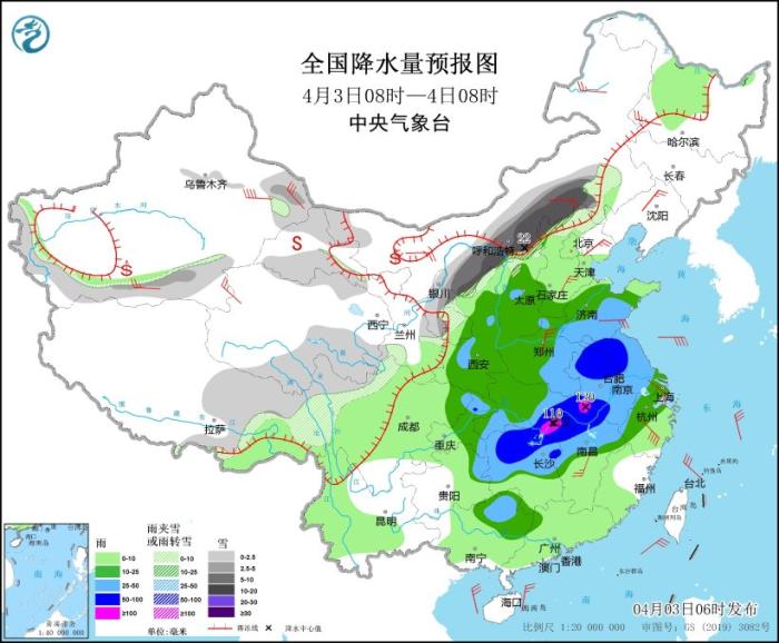4月3日08時至4日08時,新疆南疆盆地和東部、西藏東部、西北地區(qū)中部和東北部、內(nèi)蒙古中部、川西高原北部、陜西北部、山西北部、河北北部等地部分地區(qū)有小到中雪或雨夾雪,其中,內(nèi)蒙古中部、河北西北部等地部分地區(qū)有大到暴雪,局地大暴雪(20~22毫米)。湖北東部和南部、湖南北部、江西北部、安徽、河南東部、山東南部、江蘇及陜西中部、山西中部、重慶北部、廣西東北部等地有大到暴雨,其中,安徽西南部、湖北東部、湖南北部等地部分地區(qū)有大暴雨(100~130毫米)。內(nèi)蒙古、東北地區(qū)西部、新疆南部、華北、黃淮、江淮等地部分地區(qū)有4~6級風,局部有6~7級風(見圖3)。渤海、黃海西南部、東海西北部、長江口附近海域?qū)⒂?級、陣風9級的大風,其中渤海灣將有9級、陣風10級的大風。