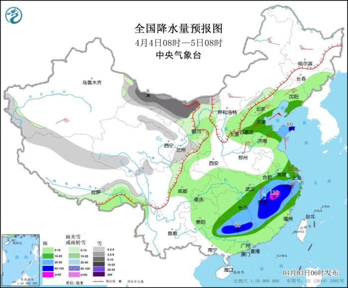 4月4日08時至5日08時,內(nèi)蒙古西部、新疆南疆盆地和東部、西藏北部和東部、西北地區(qū)中東部、川西高原北部等地部分地區(qū)有小雪或雨夾雪,其中,內(nèi)蒙古西北部、新疆東部等地部分地區(qū)有中到大雪(5~8毫米)。遼東半島、華北東部、山東半島、江南大部、華南北部等地部分地區(qū)有中到大雨,其中,山東東部、安徽南部、湖南南部、江西中東部、浙江西部、福建西北部、廣西東北部、廣東西北部等地部分地區(qū)有暴雨或大暴雨(100~110毫米)。內(nèi)蒙古中東部、東北地區(qū)、新疆南疆盆地、華北、江淮東部、江南東部等地部分地區(qū)有4~6級風(見圖4)。渤海、渤海海峽將有7~9級、陣風10級的偏北風,黃海中部和南部將有7~8級、陣風9級的東南風,東海北部將有7~8級、陣風9級的東南風轉(zhuǎn)6~7級、陣風8級的偏南風。