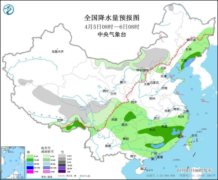 4月5日08時至6日08時,內(nèi)蒙古西部、西藏北部和東部、青海南部、山西北部、河北北部、川西高原北部等地部分地區(qū)有小雪或雨夾雪。西藏東南部、東北地區(qū)東部、西南地區(qū)東部、江漢西部、江南、華南大部、臺灣島等地部分地區(qū)有小到中雨,其中,遼寧東南部、廣東中北部、福建中部等地部分地區(qū)有大雨,局部有暴雨。內(nèi)蒙古中西部等地部分地區(qū)有4~6級風(見圖5)。