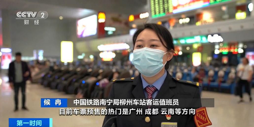 中國鐵路南寧局柳州車站客運(yùn)值班員 候冉:目前車票預(yù)售的熱門是廣州、成都、云南等方向。預(yù)計(jì)整個(gè)五一假期,柳州站增加南寧、賀州等方向6趟車。