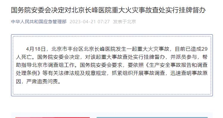 國務(wù)院安委會決定對北京長峰醫(yī)院重大火災事故查處實行掛牌督辦