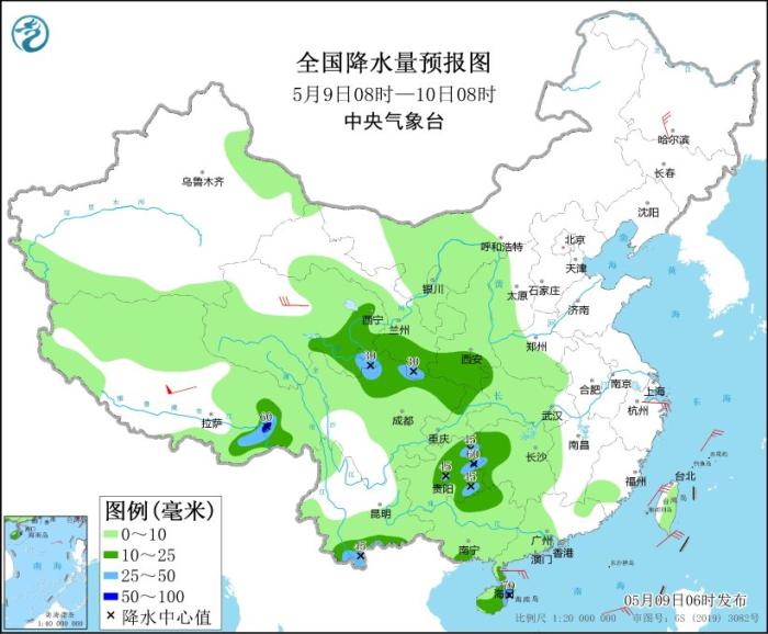 5月9日08時至10日08時,甘肅西南部、青海東部和南部、西藏東部等地的部分地區(qū)有中到大雪或雨夾雪,其中青海東南部等地局地有暴雪;西北地區(qū)東南部、四川北部和東部、重慶、貴州中東部、湖南西部、云南南部、廣西北部和東南部、廣東西南部、海南島及西藏東南部等地的部分地區(qū)有中到大雨,其中,貴州東部、云南南部、海南島局地有暴雨(50~70毫米)。內(nèi)蒙古東北部、黑龍江大部、浙江北部、廣西東南部沿海等地部分地區(qū)有4~6級風(fēng),其中西藏中部部分地區(qū)有7~8級風(fēng)。