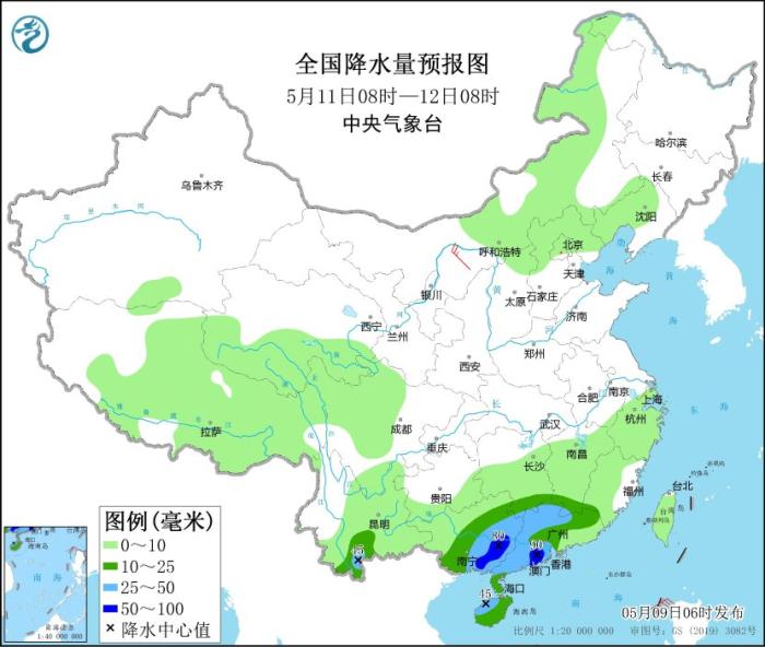 全國降水量預(yù)報圖(5月11日08時-12日08時)