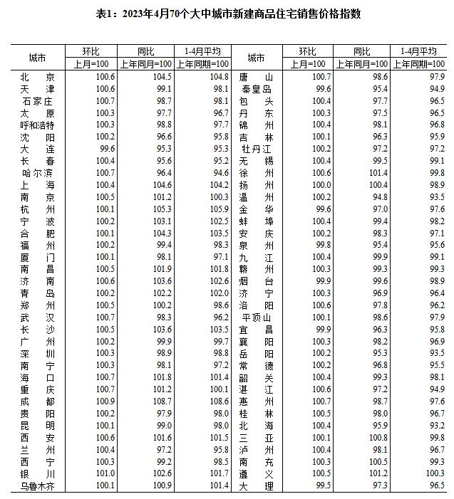 中新網5月17日電 國家統(tǒng)計局網站17日發(fā)布2023年4月份70個大中城市商品住宅銷售價格變動情況,國家統(tǒng)計局城市司首席統(tǒng)計師繩國慶解讀表示,2023年4月份,70個大中城市中商品住宅銷售價格環(huán)比上漲城市個數減少,同比上漲城市個數增加。70個大中城市商品住宅銷售價格環(huán)比整體漲幅回落、二手住宅環(huán)比漲幅回落更為明顯,各線城市商品住宅銷售價格同比上漲或降勢趨緩。