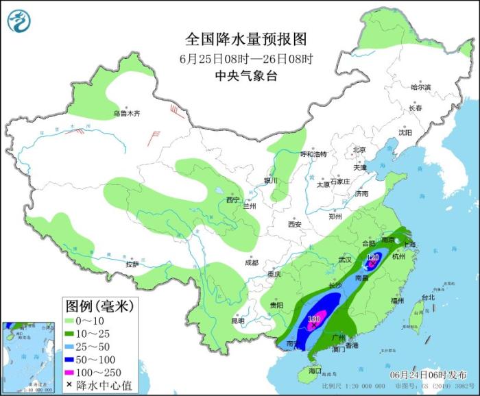 6月24日08時(shí)至25日08時(shí),蘇皖南部、上海、浙江北部和西部、福建西北部、江西大部、湖南南部、廣西大部、廣東中西部、云南南部等地部分地區(qū)有大到暴雨,其中,江蘇東南部、上海東部、廣西中部和南部沿海、廣東北部等地局部地區(qū)有大暴雨(100~160毫米)。