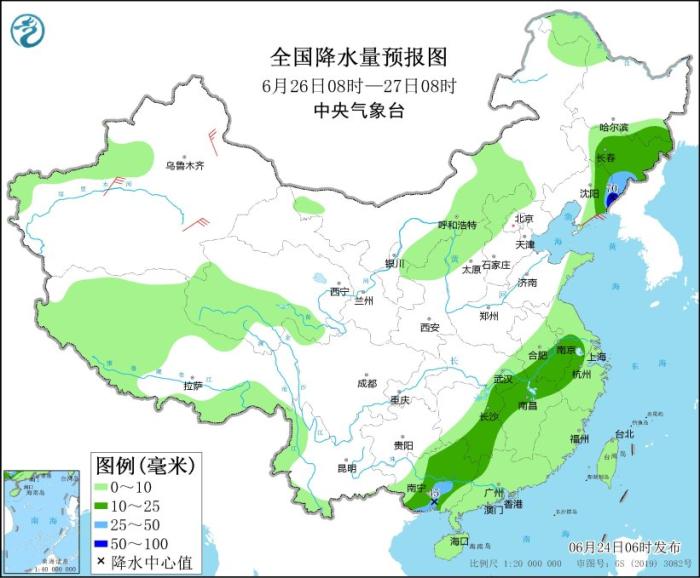 6月26日08時(shí)至27日08時(shí),吉林中東部、遼寧東北部、蘇皖南部、浙江西部、江西北部、湖南東部和南部、廣西大部等地有中到大雨,局地暴雨(50~70毫米)。