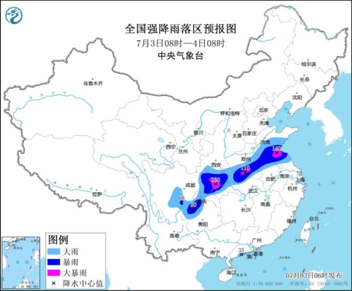 中央氣象臺7月3日06時繼續(xù)發(fā)布暴雨藍(lán)色預(yù)警:預(yù)計,7月3日08時至4日08時,山東中南部、江蘇北部、安徽北部、河南東部和南部、湖北北部和西部、陜西南部、重慶、四川東部、貴州西北部、云南東北部以及廣東西南部沿海等地部分地區(qū)有大到暴雨,其中,山東南部、江蘇北部、河南南部、重慶北部、四川東北部等地局地有大暴雨(100~160毫米)。上述部分地區(qū)伴有短時強降水(最大小時降雨量30~50毫米,局地可超過60毫米),局地有雷暴大風(fēng)等強對流天氣。