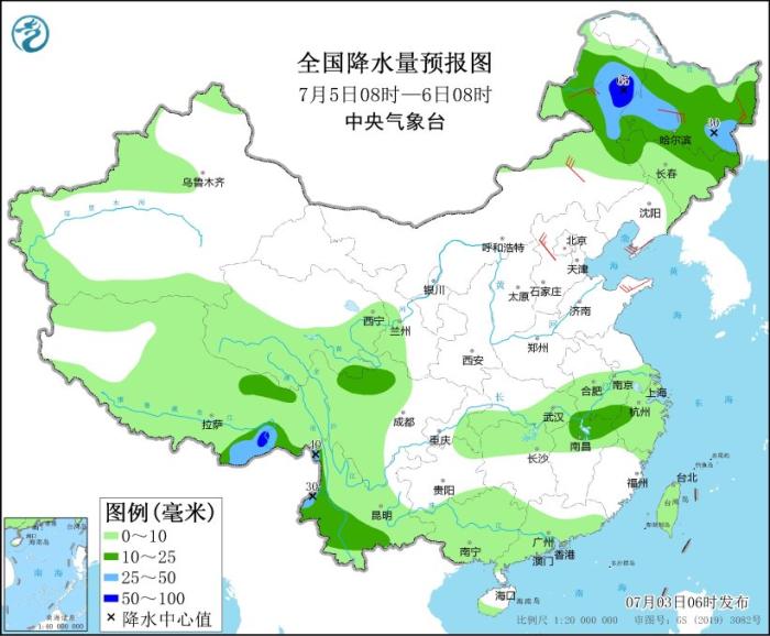 7月4日08時至5日08時,內(nèi)蒙古東部、黑龍江南部、吉林、遼寧以及蘇皖南部、湖北西南部、湖南北部、廣東南部、廣西北部和西部、云南大部、西藏東南部等地部分地區(qū)有中到大雨,其中,內(nèi)蒙古東北部、黑龍江西南部、吉林中西部、遼寧中東部、西藏東南部等地部分地區(qū)有暴雨或大暴雨(100~120毫米)。內(nèi)蒙古、華北北部和西部、黃淮東部、東北地區(qū)南部等地部分地區(qū)有4~6級風(fēng)。