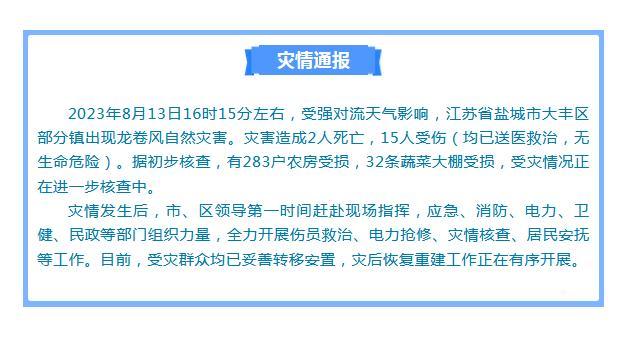 中新網(wǎng)8月13日電 據(jù)江蘇鹽城大豐區(qū)委區(qū)政府官方微信消息,8月13日16時(shí)15分左右,受強(qiáng)對(duì)流天氣影響,江蘇省鹽城市大豐區(qū)部分鎮(zhèn)出現(xiàn)龍卷風(fēng)自然災(zāi)害。災(zāi)害造成2人死亡,15人受傷(均已送醫(yī)救治,無(wú)生命危險(xiǎn))。據(jù)初步核查,有283戶(hù)農(nóng)房受損,32條蔬菜大棚受損,受災(zāi)情況正在進(jìn)一步核查中。
