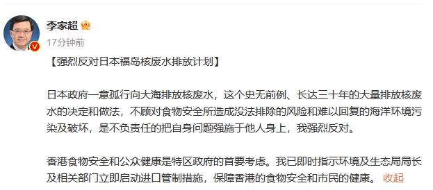 中新網(wǎng)8月22日電 香港特區(qū)行政長官李家超22日在社交媒體發(fā)文表示,強烈反對日本福島核廢水排放計劃。