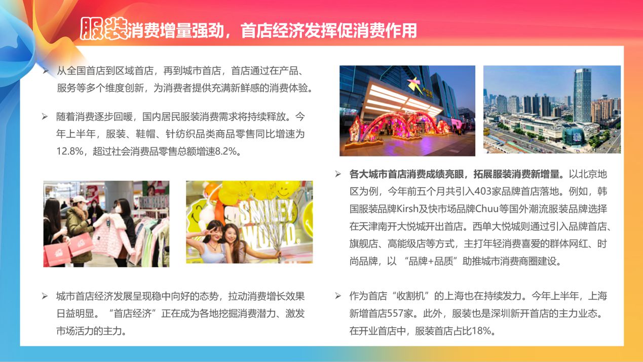 在服裝消費(fèi)方面,隨著消費(fèi)逐步回暖,國內(nèi)居民服裝消費(fèi)需求將持續(xù)釋放。以北京地區(qū)為例,今年前五個月共引入403家品牌首店落地。例如,韓國服裝品牌Kirsh及快市場品牌Chuu等國外潮流服裝品牌選擇在天津南開大悅城開出首店。西單大悅城則通過引入品牌首店、旗艦店、高能級店等方式,主打年輕消費(fèi)喜愛的群體網(wǎng)紅、時尚品牌,以“品牌+品質(zhì)”助推城市消費(fèi)商圈建設(shè)。《報告》認(rèn)為,“首店經(jīng)濟(jì)”正在成為各地挖掘消費(fèi)潛力、激發(fā)市場活力的主力。