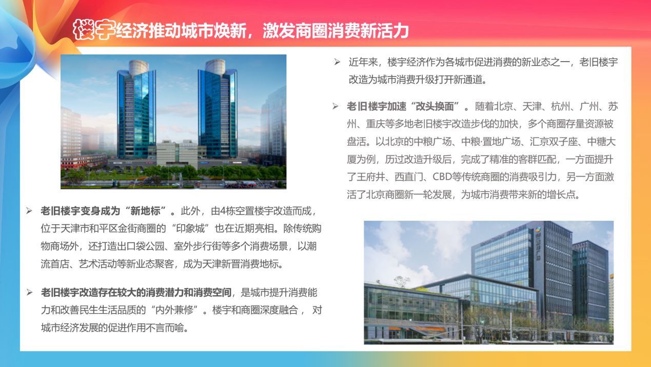 老舊樓宇改造存在較大的消費(fèi)潛力和消費(fèi)空間,是城市提升消費(fèi)能力和改善民生生活品質(zhì)的“內(nèi)外兼修”。《報告》梳理指出,隨著北京、天津、杭州、廣州、蘇州、重慶等多地老舊樓宇改造步伐的加快,多個商圈存量資源被盤活。以北京的中糧廣場、中糧·置地廣場、匯京雙子座、中糖大廈為例,通過舊改提升、輕(中)資產(chǎn)輸出等方式,打造高端商務(wù)地標(biāo),完成了精準(zhǔn)的客群匹配,一方面提升了王府井、西直門、CBD等傳統(tǒng)商圈的消費(fèi)吸引力,另一方面激活了北京商圈新一輪發(fā)展,推動片區(qū)重構(gòu)和能級提升,為城市消費(fèi)帶來新的增長點(diǎn)。