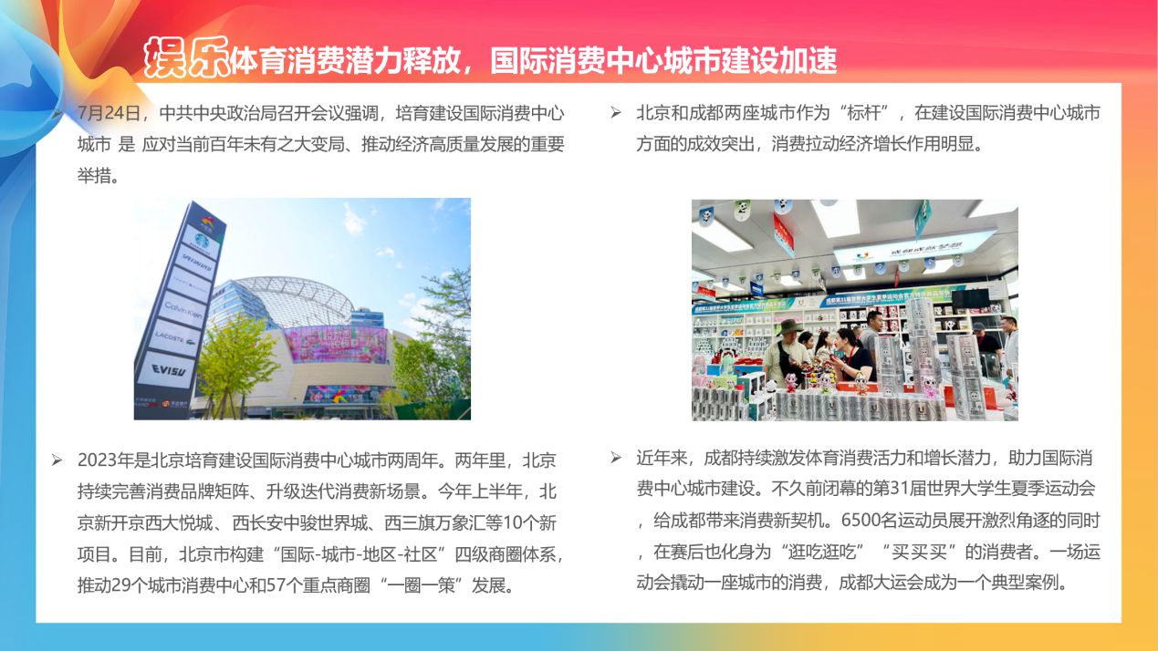 在娛樂體育消費(fèi)方面,北京、成都兩座城市作為“標(biāo)桿”,在建設(shè)國際消費(fèi)中心城市方面的成效突出,消費(fèi)拉動經(jīng)濟(jì)增長作用明顯。以北京為例,2023年是北京培育建設(shè)國際消費(fèi)中心城市兩周年。兩年里,北京持續(xù)完善消費(fèi)品牌矩陣、升級迭代消費(fèi)新場景。今年上半年,北京新開京西大悅城、西長安中駿世界城、西三旗萬象匯等10個新項(xiàng)目。目前,北京市構(gòu)建“國際-城市-地區(qū)-社區(qū)”四級商圈體系,推動29個城市消費(fèi)中心和57個重點(diǎn)商圈“一圈一策”發(fā)展。