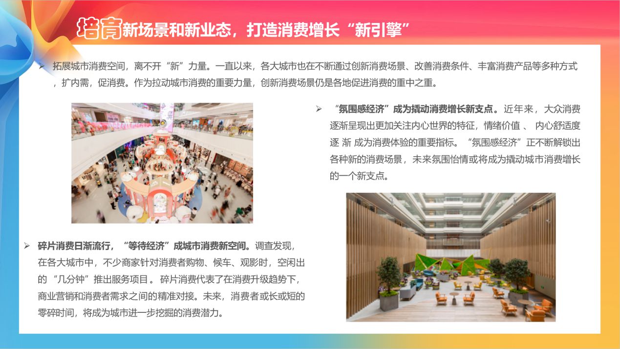 《報告》認(rèn)為,推動現(xiàn)有消費(fèi)載體改造提升,進(jìn)行功能擴(kuò)展和業(yè)態(tài)創(chuàng)新,從單一功能的場所向文體商旅綜合體轉(zhuǎn)變,打造更多的綜合性消費(fèi)空間和場景,是各地打造“特色”“創(chuàng)意”“美學(xué)”“精致”城市名片,促進(jìn)消費(fèi)一大重要舉措。
