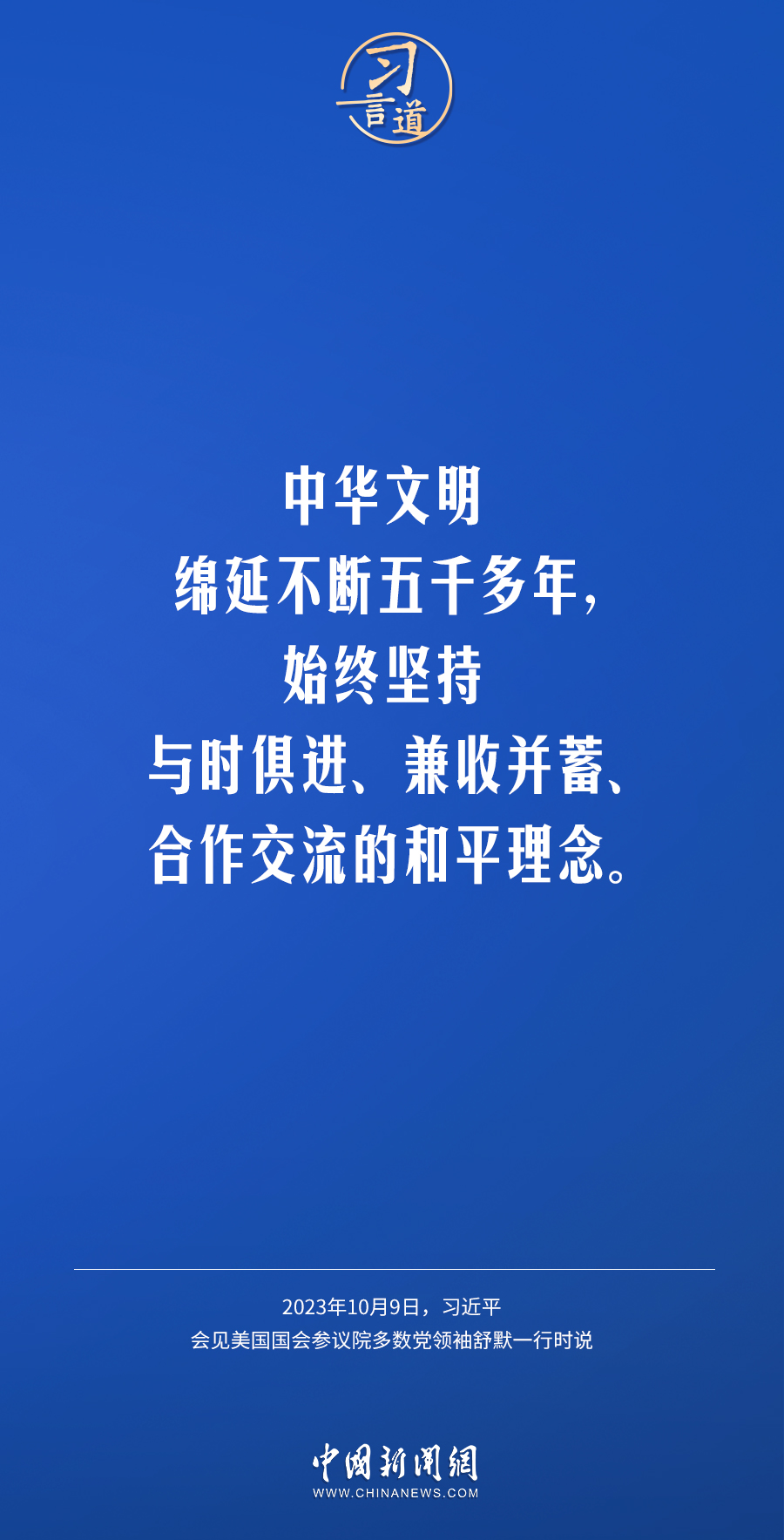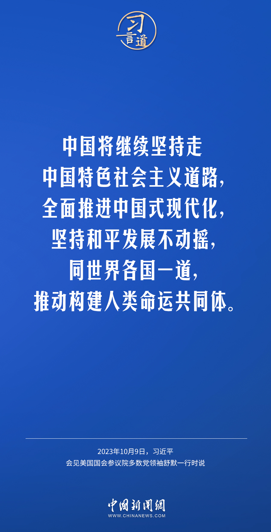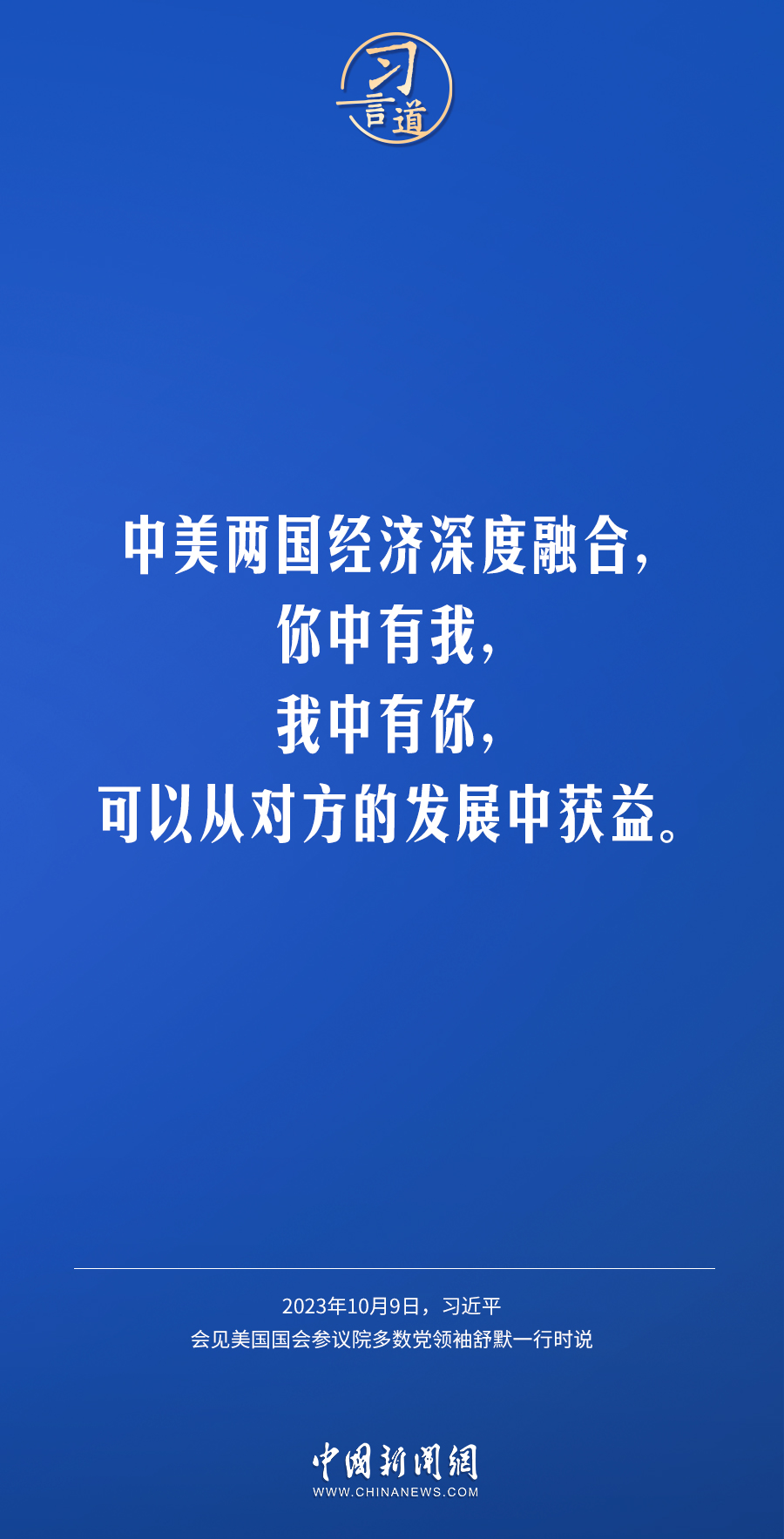 10月9日下午,國(guó)家主席習(xí)近平在人民大會(huì)堂會(huì)見(jiàn)美國(guó)國(guó)會(huì)參議院多數(shù)黨領(lǐng)袖舒默率領(lǐng)的美國(guó)國(guó)會(huì)參議院兩黨代表團(tuán)。習(xí)近平指出——