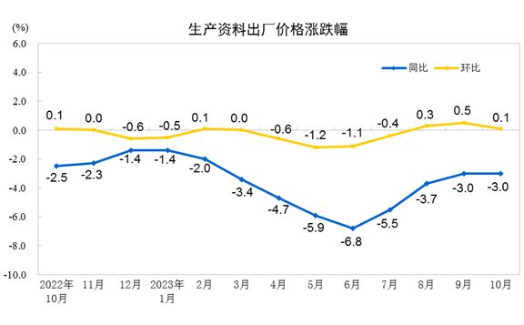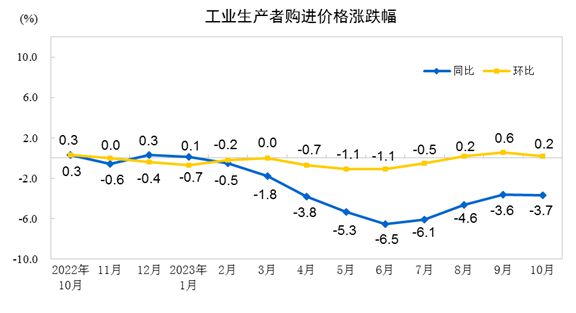 中新網(wǎng)11月9日電 據(jù)國(guó)家統(tǒng)計(jì)局網(wǎng)站消息,2023年10月份,全國(guó)工業(yè)生產(chǎn)者出廠價(jià)格同比下降2.6%,環(huán)比持平;工業(yè)生產(chǎn)者購(gòu)進(jìn)價(jià)格同比下降3.7%,環(huán)比上漲0.2%。1—10月平均,工業(yè)生產(chǎn)者出廠價(jià)格比上年同期下降3.1%,工業(yè)生產(chǎn)者購(gòu)進(jìn)價(jià)格下降3.6%。