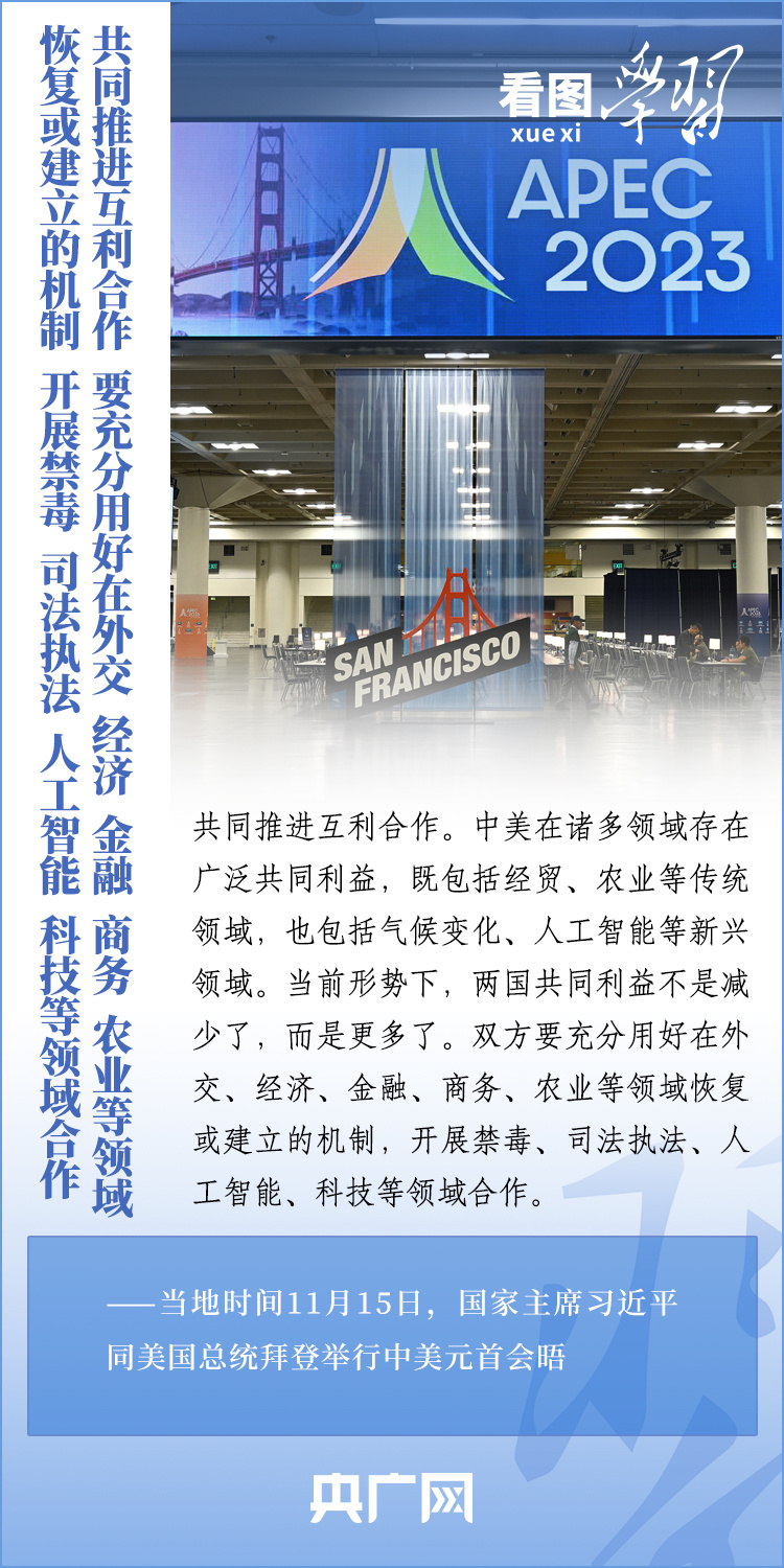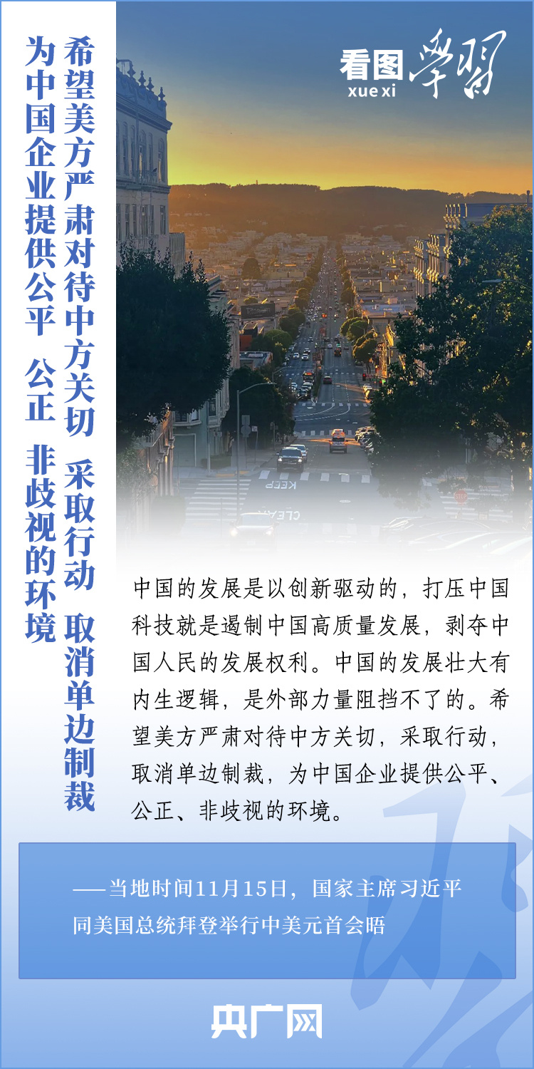 當(dāng)?shù)貢r(shí)間11月15日,國(guó)家主席習(xí)近平在美國(guó)舊金山斐洛里莊園同美國(guó)總統(tǒng)拜登舉行中美元首會(huì)晤。兩國(guó)元首就事關(guān)中美關(guān)系的戰(zhàn)略性、全局性、方向性問(wèn)題以及事關(guān)世界和平和發(fā)展的重大問(wèn)題坦誠(chéng)深入地交換了意見(jiàn)。習(xí)近平主席指出,大國(guó)競(jìng)爭(zhēng)解決不了中美兩國(guó)和世界面臨的問(wèn)題。這個(gè)地球容得下中美兩國(guó)。中美各自的成功是彼此的機(jī)遇。一起來(lái)學(xué)習(xí)!