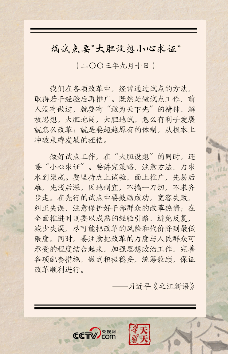 習(xí)近平還進(jìn)一步分析,做好試點(diǎn)工作,在“大膽設(shè)想”的同時(shí),還要“小心求證”……要堅(jiān)持點(diǎn)上試驗(yàn),面上推廣,先易后難,先淺后深,因地制宜,不搞一刀切,不求齊步走……