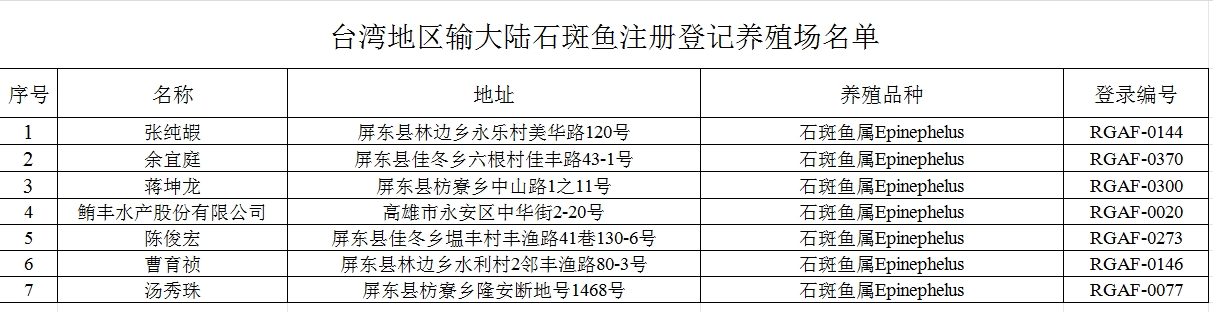 臺(tái)灣地區(qū)輸大陸石斑魚注冊(cè)登記養(yǎng)殖場(chǎng)名單。 圖片來源:海關(guān)總署網(wǎng)站