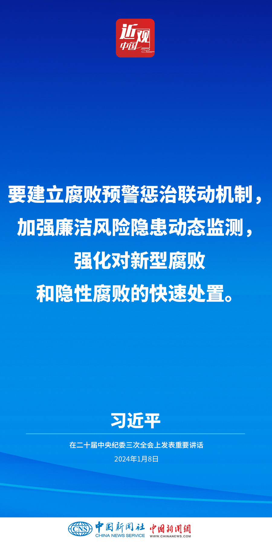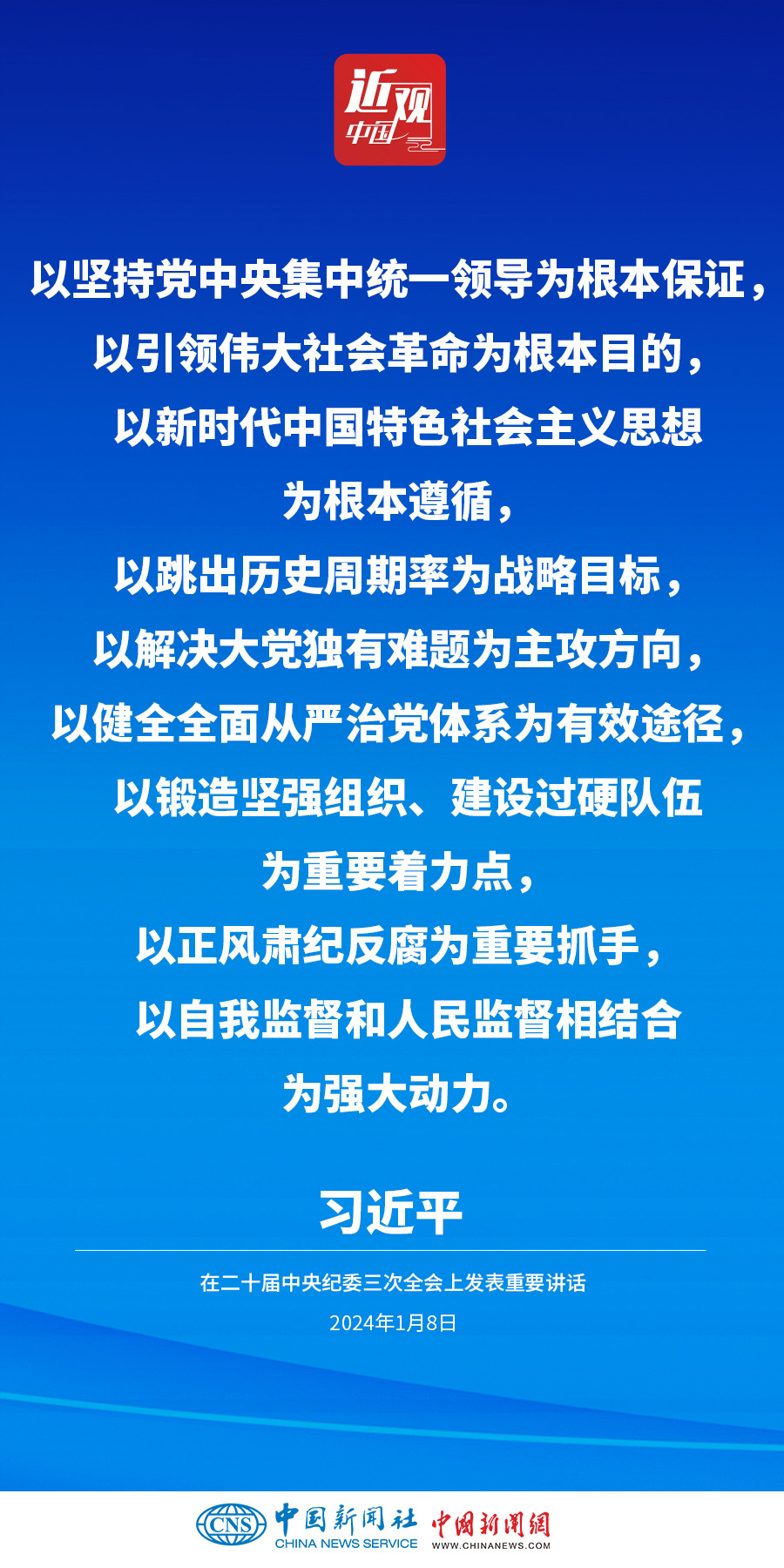 中共中央總書記、國家主席、中央軍委主席習近平8日上午在中國共產(chǎn)黨第二十屆中央紀律檢查委員會第三次全體會議上發(fā)表重要講話。他強調(diào)——