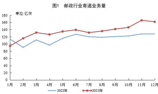 12月份,郵政行業(yè)寄遞業(yè)務量完成161.7億件,同比增長26.5%。其中,快遞業(yè)務量完成132.6億件,同比增長27.9%。