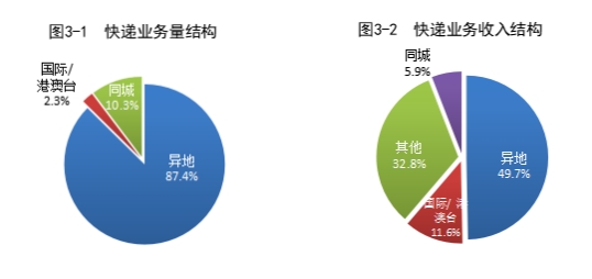 2023年,同城、異地、國際/港澳臺快遞業(yè)務量分別占全部快遞業(yè)務量的10.3%、87.4%和2.3%;業(yè)務收入分別占全部快遞收入的5.9%、49.7%和11.6%。與去年同期相比,同城快遞業(yè)務量的比重下降1.3個百分點,異地快遞業(yè)務量的比重上升0.8個百分點,國際/港澳臺業(yè)務量的比重上升0.5個百分點。
