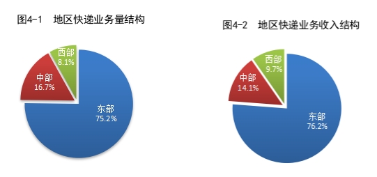 2023年,東、中、西部地區(qū)快遞業(yè)務量比重分別為75.2%、16.7%和8.1%,業(yè)務收入比重分別為76.2%、14.1%和9.7%。與去年同期相比,東部地區(qū)快遞業(yè)務量比重下降1.6個百分點,快遞業(yè)務收入比重下降1.4個百分點;中部地區(qū)快遞業(yè)務量比重上升1.0個百分點,快遞業(yè)務收入比重上升0.7個百分點;西部地區(qū)快遞業(yè)務量比重上升0.6個百分點,快遞業(yè)務收入比重上升0.7個百分點。
