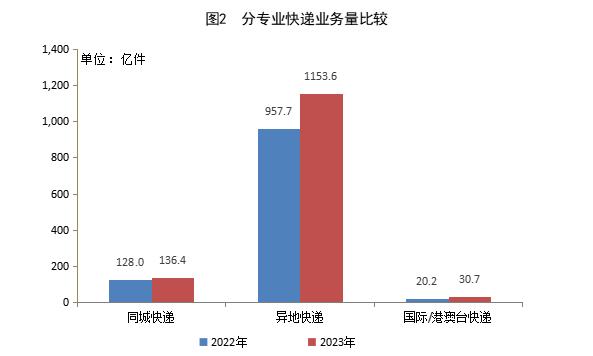 2023年,同城快遞業(yè)務量累計完成136.4億件,同比增長6.6%;異地快遞業(yè)務量累計完成1153.6億件,同比增長20.5%;國際/港澳臺快遞業(yè)務量累計完成30.7億件,同比增長52.0%。