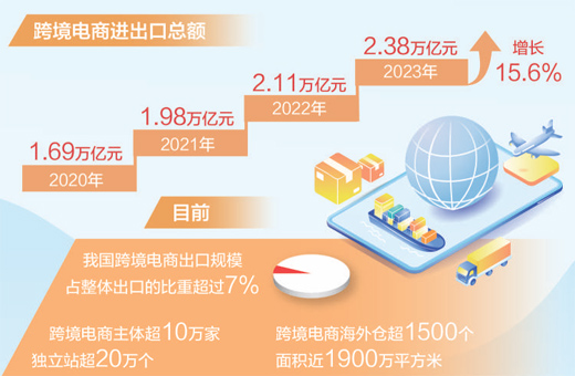 據海關測算,2023年,我國跨境電商進出口總額2.38萬億元,增長15.6%。其中,出口1.83萬億元,增長19.6%;進口5483億元,增長3.9%??缇畴娚炭焖侔l(fā)展,既滿足了國內消費者多樣化個性化需求,又助力我國產品通達全球,成為外貿發(fā)展的重要動能。