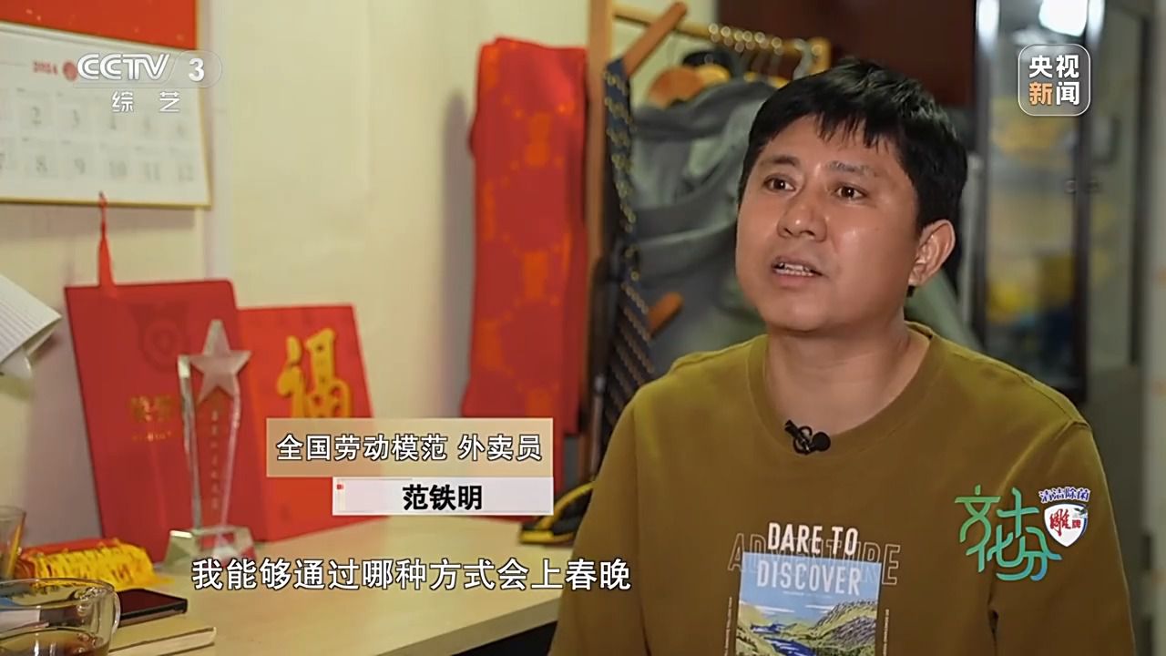 全國勞動模范 外賣員 范鐵明:2023年,我被評為全國最美外賣配送員,這個獎項,不單純是給我個人的,實際上是對新就業(yè)群體,對騎手的一個認(rèn)可。根本就沒有想到我能夠通過哪種方式會上春晚,因為我又不是專業(yè)的演職人員,當(dāng)時我并不是很相信,我們分配的是《勞動最光榮》,它是一個通過動畫片的形式,就是我們兒時都會看一些動畫片,動畫片里都會有一些主人公,比如說《黑貓警長》當(dāng)中的黑貓警長,《大鬧天宮》里的孫悟空,包括《小貓釣魚》里頭的貓媽媽,當(dāng)然都是我們當(dāng)時崇拜的一個對象,最終我們成為或即將成為他們。