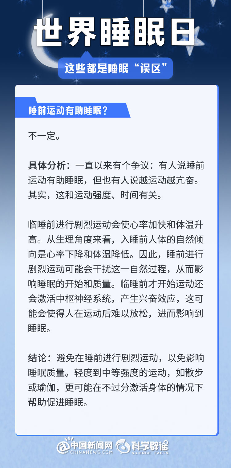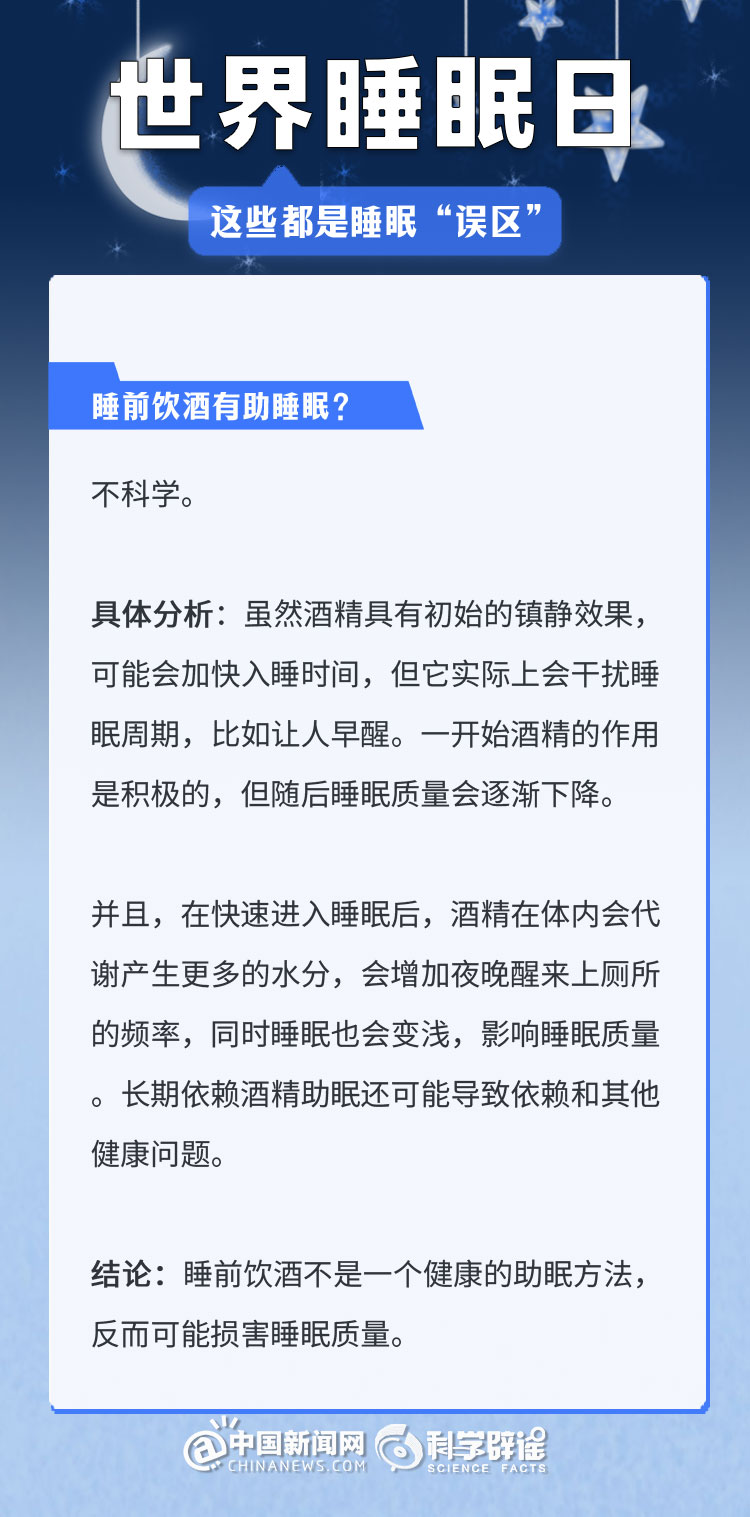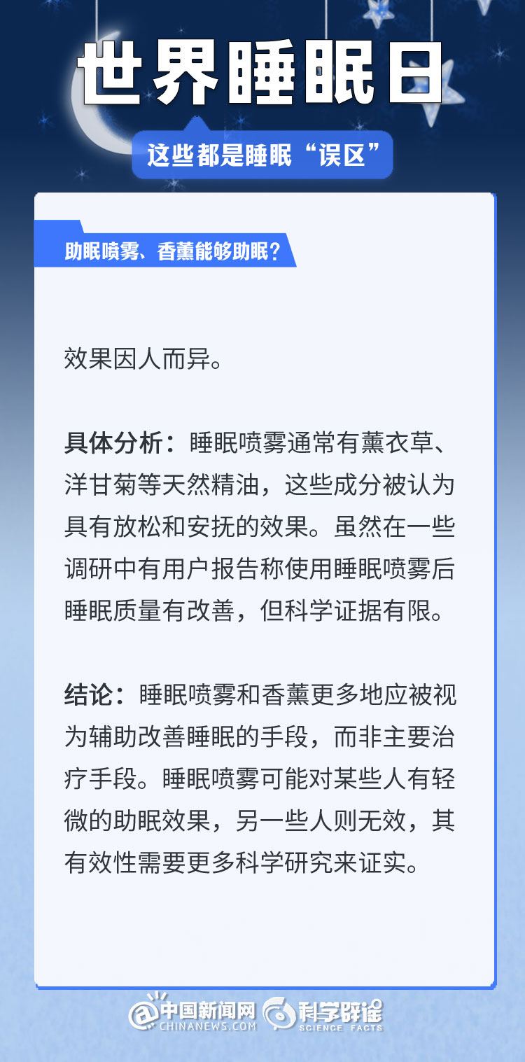 中新網(wǎng)3月21日電 《中國(guó)睡眠研究報(bào)告(2024)》顯示,2023年居民睡眠指數(shù)為62.61分,較2022年降低了5.16。去年的報(bào)告中,曾有近半數(shù)民眾每晚平均睡眠時(shí)長(zhǎng)不足8小時(shí)(47.55%)。很多人正在經(jīng)受著睡眠問(wèn)題的困擾,為了避免大家被誤導(dǎo),我們總結(jié)了幾個(gè)生活中常見(jiàn)的睡眠誤區(qū),一起來(lái)了解一下吧!(來(lái)源:科學(xué)辟謠 中國(guó)新聞網(wǎng)微博)