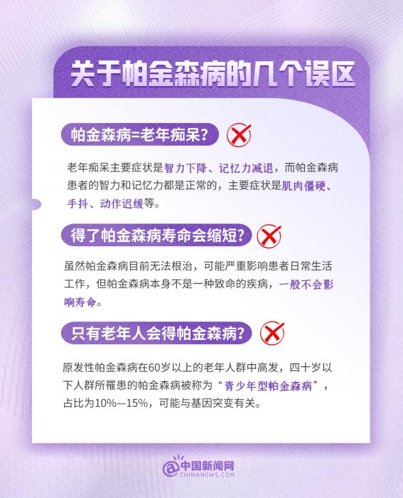 中新網(wǎng)4月11日電 帕金森病是威脅老年人健康的“沉默殺手”。帕金森病=老年癡呆?得了帕金森病壽命會(huì)縮短?只有老年人會(huì)得帕金森???今天是世界帕金森病日,這些有關(guān)帕金森病的小知識(shí),一起了解!