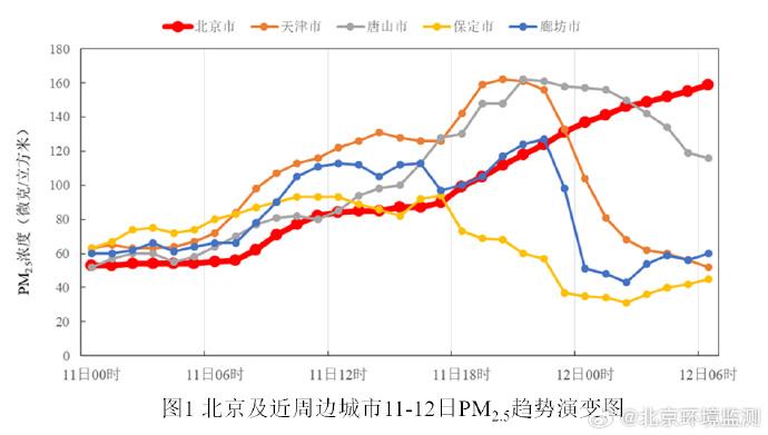顯著不利氣象條件造成京津冀區(qū)域污染水平快速上升,形成區(qū)域性污染,11日白天北京近周邊石家莊、保定、天津等城市PM2.5快速上升,以3-4級輕中度污染水平為主,部分站點達到4-5級中重度污染;入夜后近周邊城市PM2.5污染顯著加重,天津唐山等城市達到5級重度污染水平,北京PM2.5濃度持續(xù)上升,尤其是11日夜間 PM2.5快速上升,12日凌晨至上午達到4-5級中重度污染水平。