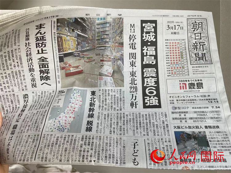 3月17日,日本《朝日新聞》在頭版頭條大篇幅刊登了地震報道。人民網 吳穎攝