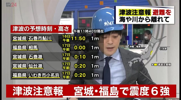 3月16日日本福島縣海域發(fā)生7.4級地震,當?shù)匕l(fā)出海嘯警報。圖片來源:日本新聞報道截圖