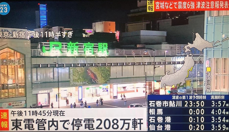 3月16日日本福島縣海域發(fā)生7.4級地震,導致大規(guī)模停電。圖片來源:日本電視臺報道截圖