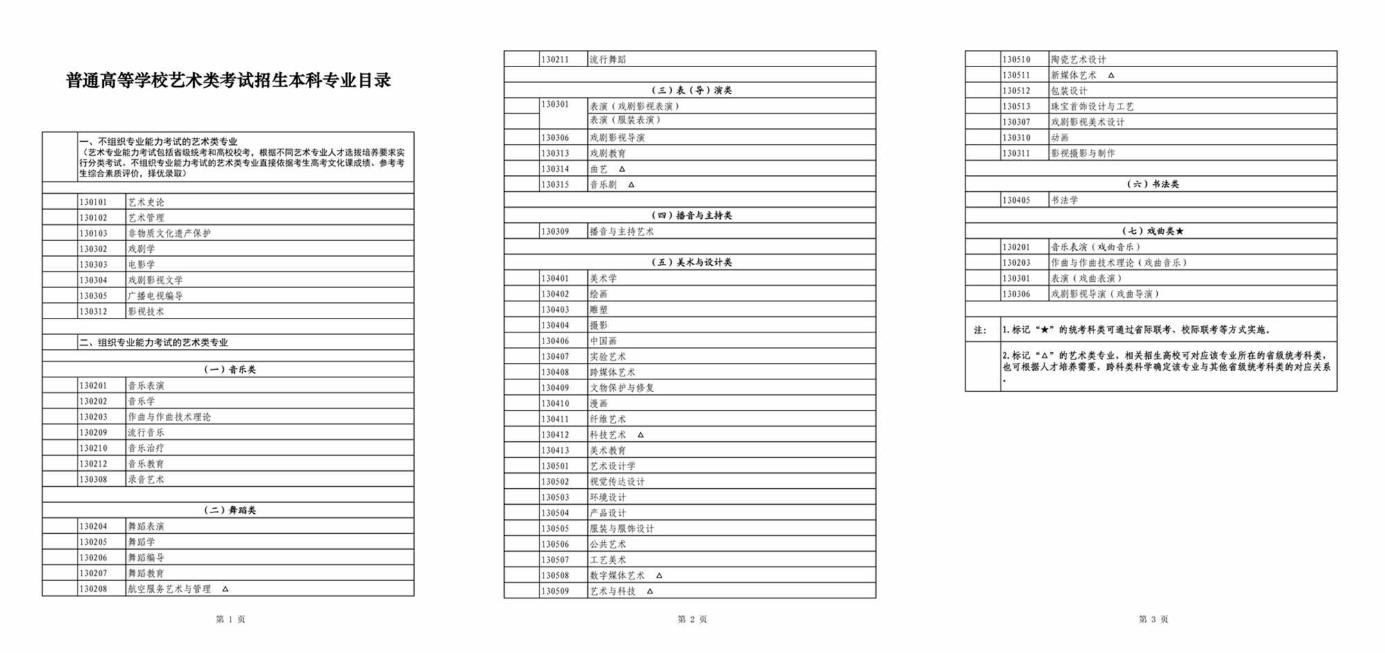 音樂(lè)類(lèi)包括音樂(lè)表演、音樂(lè)學(xué)、作曲與作曲技術(shù)理論等7個(gè)專(zhuān)業(yè),舞蹈類(lèi)包括舞蹈表演、舞蹈學(xué)、舞蹈編導(dǎo)等6個(gè)專(zhuān)業(yè),表(導(dǎo))演包括表演(戲劇影視表演)、戲劇影視導(dǎo)演、音樂(lè)劇等5個(gè)專(zhuān)業(yè),美術(shù)與設(shè)計(jì)類(lèi)包括美術(shù)學(xué)、繪畫(huà)、雕塑、攝影等28個(gè)專(zhuān)業(yè),此外還有播音與主持藝術(shù)、書(shū)法學(xué)專(zhuān)業(yè)。