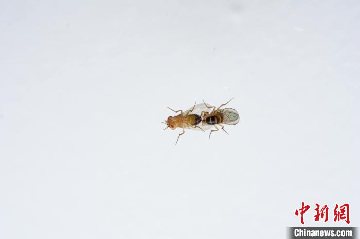 暴露在濃度略微升高的臭氧(100ppb)中15分鐘后的2只雄性果蠅開(kāi)始嘗試交配?!enjamin Fabian 攝