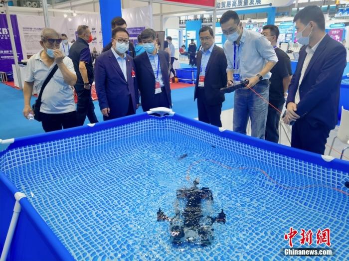 資料圖:2022年11月16日,在深圳舉行的第二十四屆中國國際高新技術成果交易會上,參展商攜“黑科技”產(chǎn)品亮相高交會。圖為深圳企業(yè)研制的潛鮫P200 PRO行業(yè)級水下機器人。 中新社記者 陳文 攝