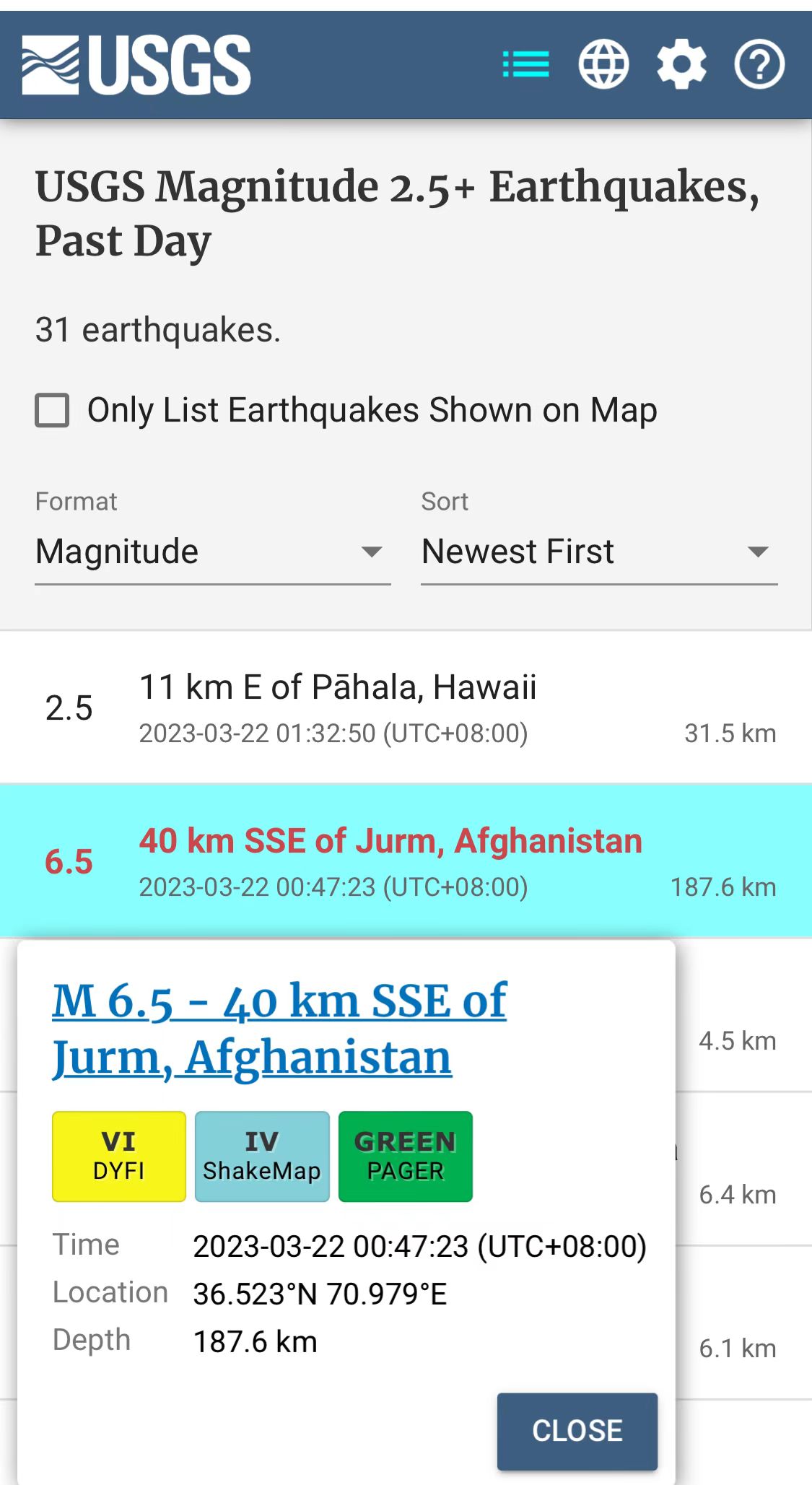 據(jù)報(bào)道,這場(chǎng)地震發(fā)生在阿富汗東北部巴達(dá)赫尚省城鎮(zhèn)尤爾姆東南偏南40公里處,震級(jí)里氏6.5級(jí),震源深度187.6公里。