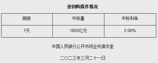 中新網(wǎng)3月21日電 據(jù)央行網(wǎng)站21日消息,為維護(hù)銀行體系流動(dòng)性合理充裕,2023年3月21日人民銀行以利率招標(biāo)方式開(kāi)展了1820億元逆回購(gòu)操作,期限為7天,中標(biāo)利率為2.00%。(中新財(cái)經(jīng))